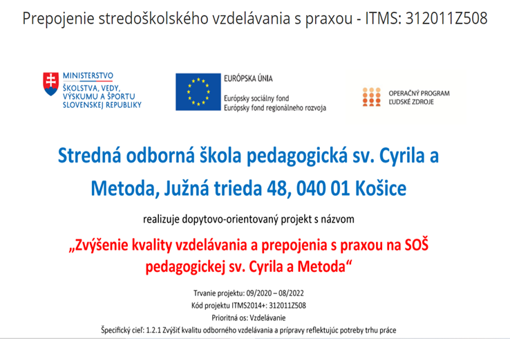 Košice, 30. september (TSKE) Na strednej odbornej pedagogickej škole sa úspešne zavŕšili aktivity projektu pod názvom Zvýšenie kvality vzdelávania a prepojenia s praxou na SOŠ pedagogickej sv. Cyrila a Metoda na základe výzvy Ministerstva školstva, vedy, výskumu a športu Slovenskej republiky v rámci Operačného programu Ľudské zdroje.